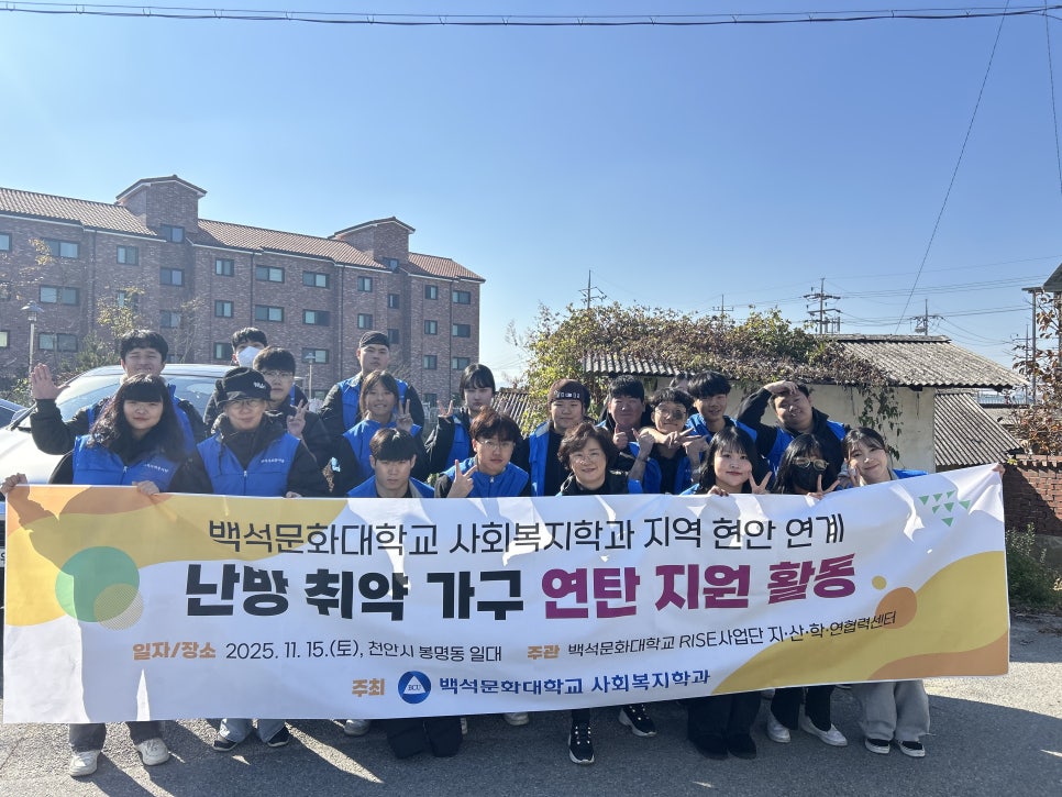 백석문화대학교(총장 이경직) 사회복지학과는 RISE사업단 지·산·학·연협력센터와 함께 지난 11월 15일(토) 오전 9시부터 충남 천안시 동남구 중앙로와 봉명로 일대에서 ‘사랑의 연탄 나눔’ 봉사활동을 펼치며 지역사회에 따뜻한 온기를 전했다.