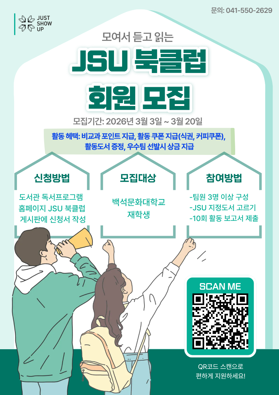 3월 3일 화요일부터 3월 31일까지 JSU북클럽 회원을 모집합니다.