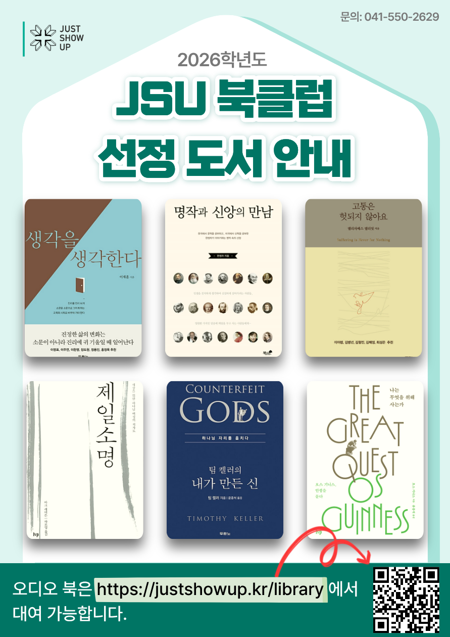 신청 접수는 도서관 -> 독서프로그램 홈페이지 -> JSU북클럽 게시판 -> 현재 클럽 에서 '클럽만들기'로 접수 가능합니다.
