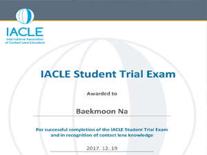 매해 전 세계 안경광학 학부 전공자들이 동시에 실시하는 IACLE STE(콘택트렌즈 인증)에 응시하고 있으며, 연속하여 100% 합격하고 있습니다.