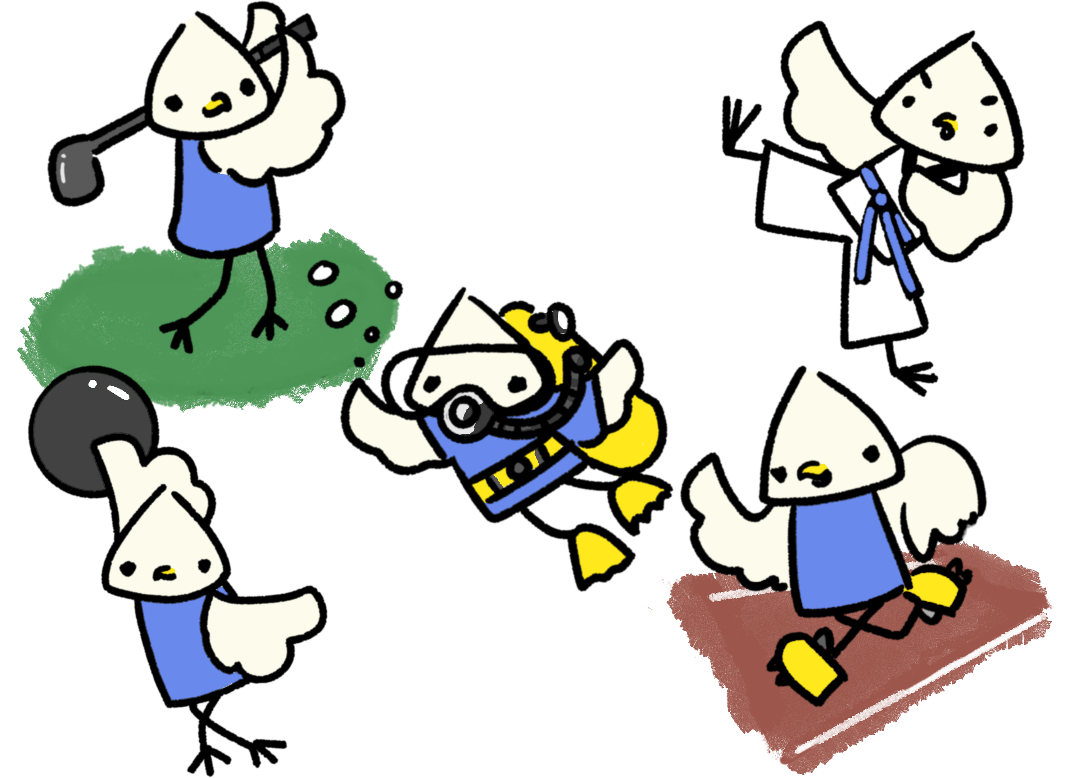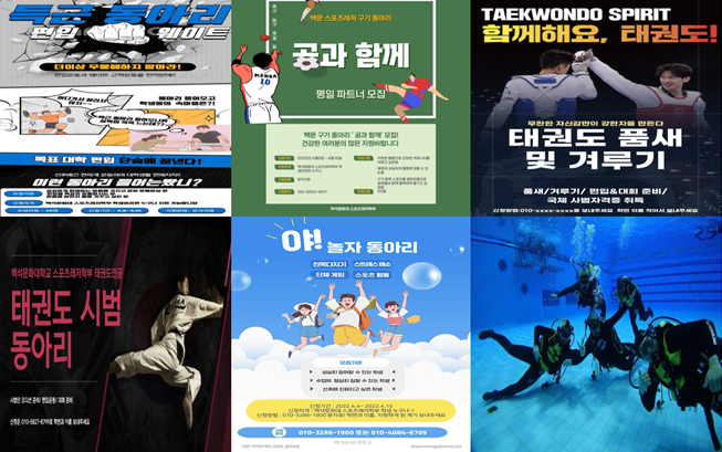 웨이트트레이닝, 구기, 태권도(겨루기·시범·품새), 레크리에이션, 스쿠버다이빙 등