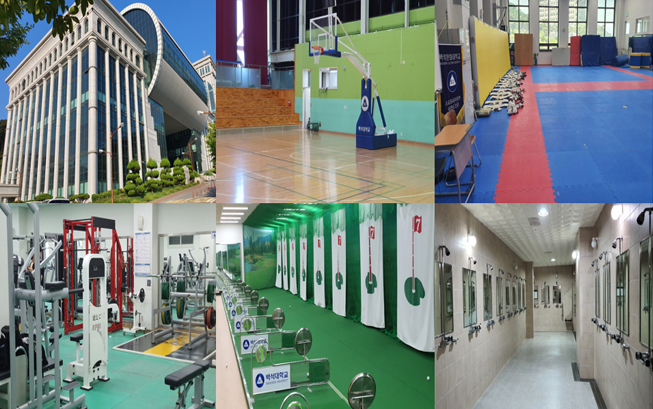 주체육관, 골프장, 체조장(다목적실), 웨이트장, 무용실, 운동검사실, 강의실, 샤워실 및 라커룸, 수원스쿠버다이빙전용실습장