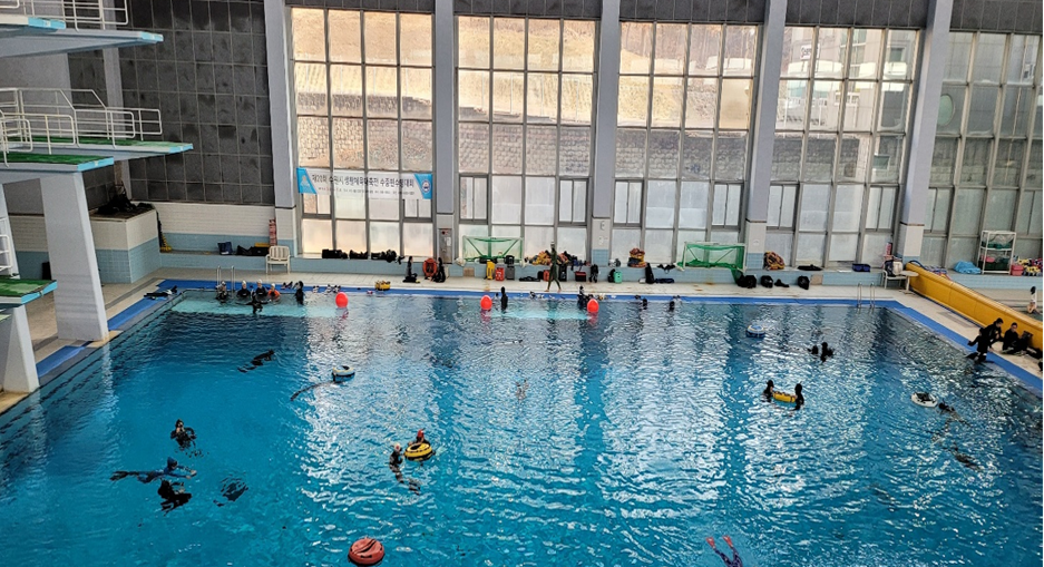 스킨스쿠버 정규교과수업 및 K-Move 스쿨 해외취업사업 연수 시 사용하고 있는 5m 다이빙풀장(수원월드컵다이빙풀)